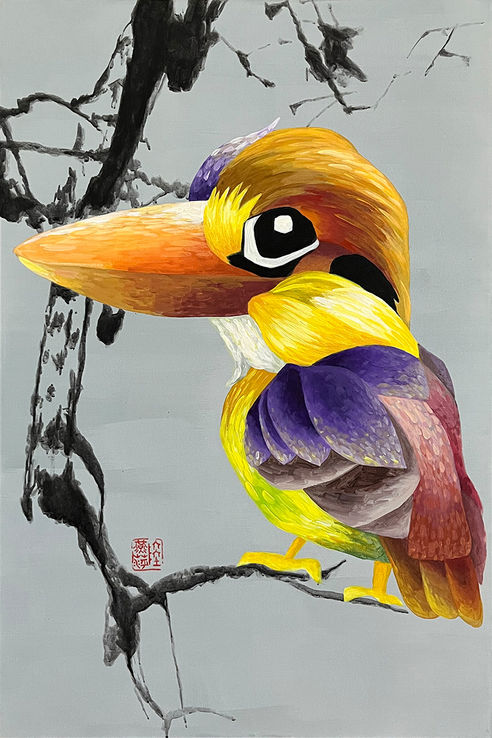 The Forest Bird Series consists of four acrylic paintings on canvas, completed in 2011, each measuring 24 x 36 inches with a depth of 3/4 inch. These works exemplify the fusion of natural beauty with artistic innovation, featuring a blend of traditional Chinese freehand floral design techniques with semi-abstract modern Western bird painting methods, creating a rich visual expression. The series focuses on vibrant bird figures against a backdrop of delicate flowers, striking a balance between elegance and modern expressiveness. The lively feather colors and decorative patterns paired with graceful blossoms highlight the perfect harmony between nature's timeless elegance and modern artistic expression. These pieces not only celebrate the harmony of nature but also elevate the combination of Chinese traditional techniques and modern Western acrylic painting methods to a new level, crafting a unique form of artistic expression.